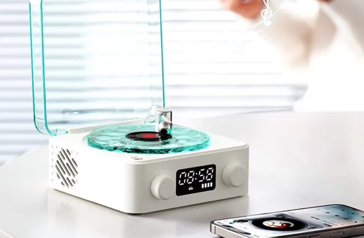 L’aspetto del giradischi è particolarmente curato e anche funzionale: il finto vinile infatti è trasparente: grazie a una luce LED sottostante, cambia colore creando spettacolari giochi di luce. Questo effetto visivo, che si completa con un display LED sul davanti che mostra l’ora e l’indicatore della batteria, lo rende utile anche quando non è in funzione.