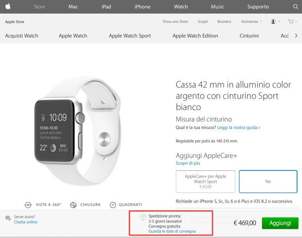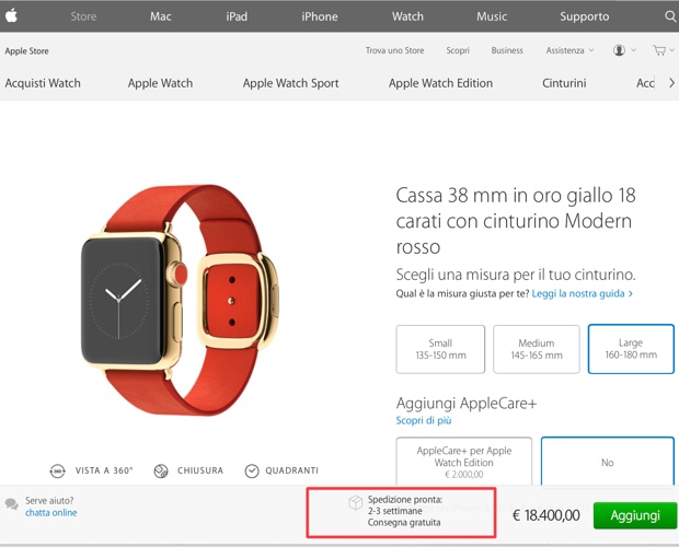 Negli altri paesi invece i tempi di spedizione Apple Watch risultano ancora leggermente superiori, come per esempio in Regno Unito, Cina ma anche in Italia, dove sempre per i modelli più gettonati Sport e Apple Watch occorre attendere tra 3 e 5 giorni. In queste due collezioni cambiando colore della cassa e dimensioni, per esempio passando a 38 mm invece che 42, con cinturini meno gettonati, i tempi di attesa scendono a un solo giorno lavorativo. In Italia invece rimangono ancora decisamente lunghi i tempi di spedizione Apple Watch Edition in oro che vanno da 2 a 3 settimane per quasi tutte le combinazioni di colore, modello e cinturino con prezzi a partire da 11.200 euro fino al modello top da ben 16.400 euro.