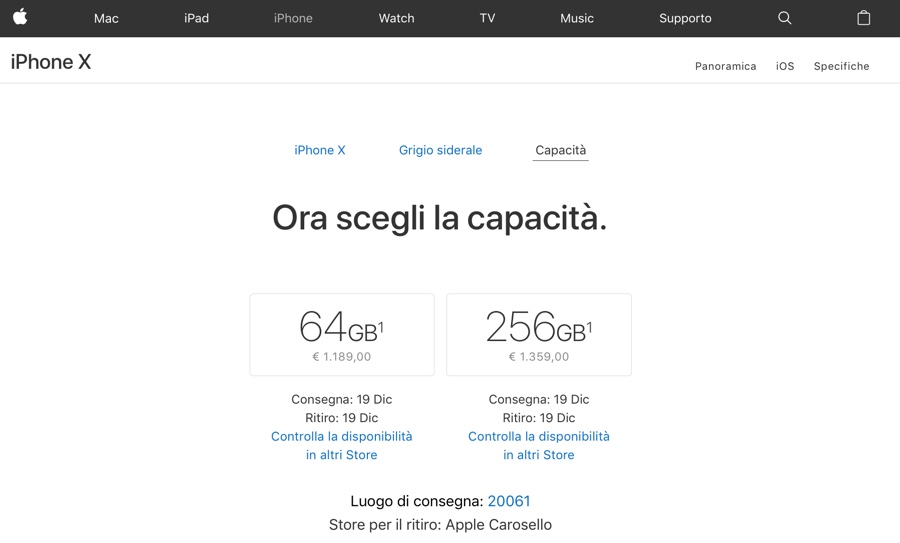 Ricordiamo che i sistemi di Apple permettono di verificare la disponibilità in tempo reale di iPhone X nei negozi più vicini all’utente, semplicemente inserendo il codice di avviamento postale: basta un click sulla voce Controlla la disponibilità in altri Store. Per chi non vuole aspettare per la consegna a domicilio, il consiglio è quello di verificare la disponibilità nei negozi anche più volte al giorno, magari cambiando le preferenze per capacità e colore.