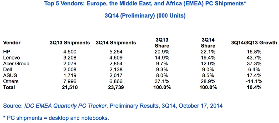 I risultati preliminari di IDC rilevano finalmente che le spedizioni di PC aumentano nel terzo trimestre nelle zone EMEA, quindi Europa, Medio Oriente e Africa, con un incoraggiante balzo del 10,4%. La domanda è trainata per lo più dagli acquisti consumer degli utenti finali di notebook, allettati da prezzi particolarmente bassi: crescono anche i desktop e gli acquisti delle società ma in misura inferiore. I computer portatili infatti registrano un aumento del 13,5% mentre i desktop del 5,2%: la parte del leone spetta all’Europa Occidentale che da sola segna un incremento del 22,7%