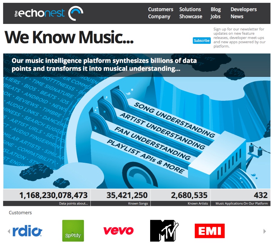 Spotify acquista Echo Nest, uno dei più noti servizi di raccomandazione musicale utilizzato da diversi attori del settore, in primis da Spotify stessa, che con questa mossa strategica si aggiudica la possibilità di controllare il servizio direttamente. L’aspetto più interessante di questa acquisizione è che Echo Nest è attualmente usato da molti dei concorrenti di Spotify, fra cui Rdio, Xbox Music e Vevo; sarà quindi importante capire quali saranno gli sviluppi dal punto di vista commerciale per i suddetti servizi.