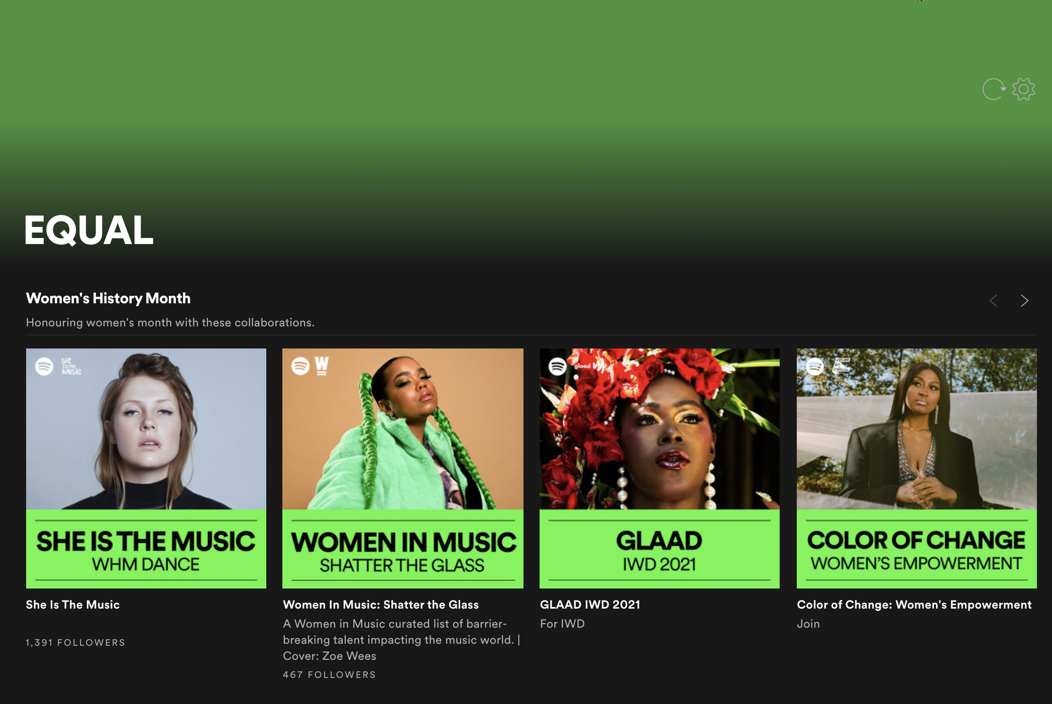 Spotify, come servizio di streaming audio più popolare al mondo, è consapevole della propria responsabilità nell’amplificare la voce delle donne tramite playlist globali quali Women of Electronic, Women of K-Pop, Women of Rock, e Galdem e podcast condotti da donne come Where Should We Begin con Esther Perel, Science Vs, e Supernatural con Ashley Flowers.