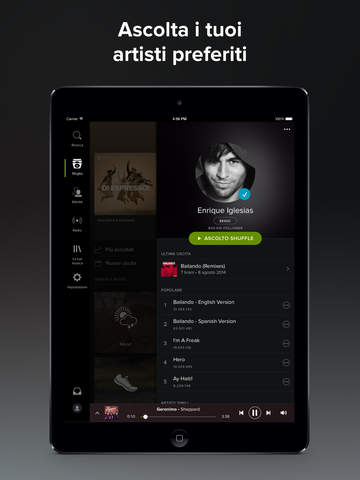 Finalmente Spotify per iPad si rifà il look: con il nuovo aggiornamento anche l’app per i tablet della Mela adotta la nuova grafica più dark e le funzioni della sezione La Tua Musica, disponibili da tempo sia nella controparte per iPhone che nell’interfaccia web del popolare servizio di musica in streaming.