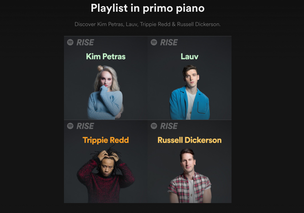 I primi quattro artisti RISE sono già stati annunciati nel post ufficiale: si tratta di artisti già abbastanza conosciuti ma che non sono riusciti a sfondare nel mercato mainstream. La lista comprende la cantante tedesca pop Kim Petras, che ha quasi 1 milione di ascolti mensili su Spotify ed è stata precedentemente inserita nelle playlist Pop Rising, Out Now, Wake Up Happy, HIIT-Pop e New Music; Lauv, il 57esimo artista più famoso sulla piattaforma e il cui singolo singolo “I Like Me Better” è già nella Top 50 globale di Spotify. Incluso anche Russell Dickerson, cantante country che si è esibito nella stagione più recente di The Bachelorette; infine Trippie Redd, uno degli artisti di maggior di successo fra quelli compresi nella playlist Rap Caviar di Spotify.