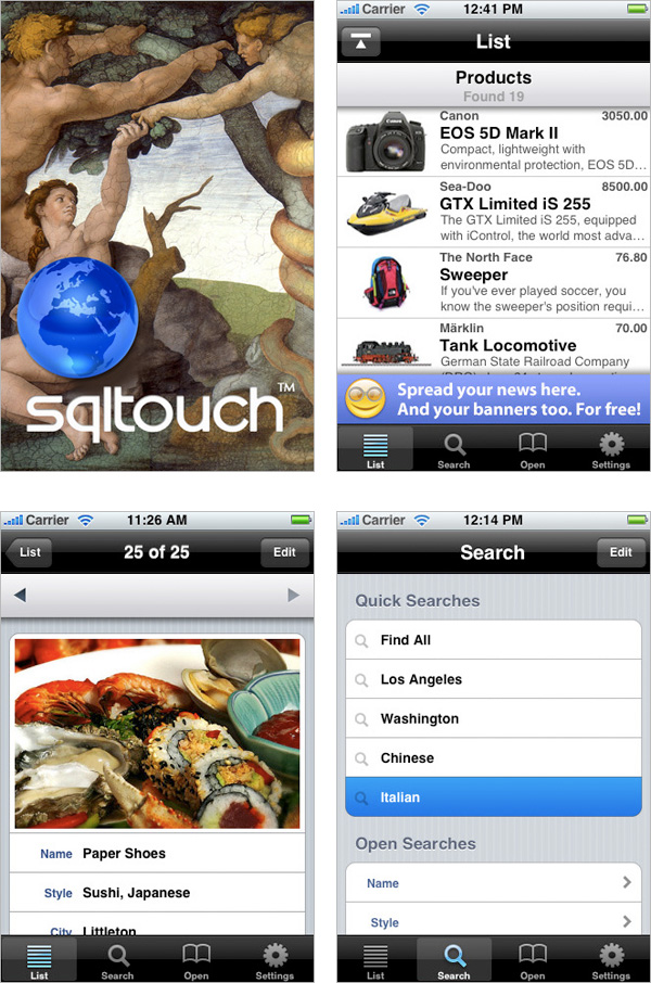 Il programma, realizzato in Italia, è molto facile da utilizzare: con un paio di clic sullo schermo è possibile consultare tutte le voci del database, per esempio per organizzare contatti, ordini, cataloghi, notizie… SQLTouch offre una interfaccia semplice da utilizzare, in puro stile iPhone e perdi più anche personalizzabile.