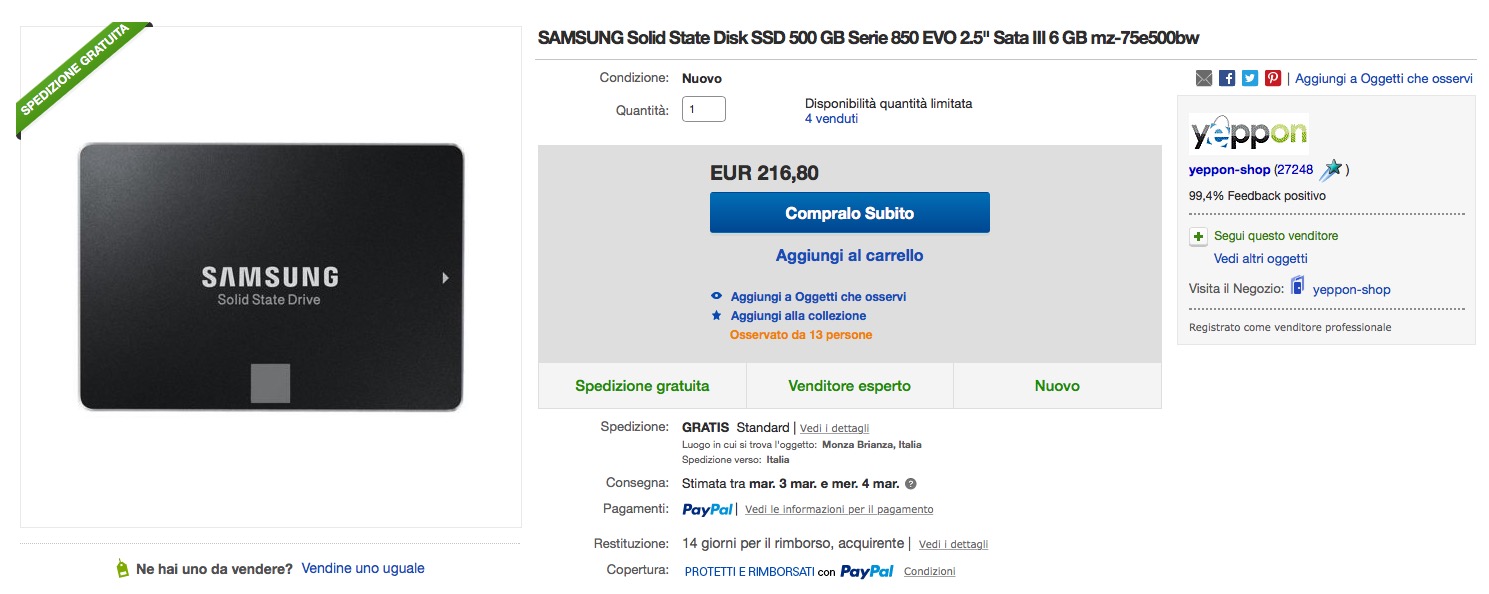 L’offerta su eBay a 216,80 euro, più bassa rispetto all’attuale sconto dello stesso SSD su Amazon (225 euro), è proposta dal venditore Yeppon, che vanta oltre 27.000 feedback, di cui positivi il 99,4% .Si tratta, pertanto, di un rivenditore sicuro e garantito. Il prodotto, ovviamente, è nuovo e viene fornito con garanzia di 24 mesi per difetti di conformità a norma di legge.