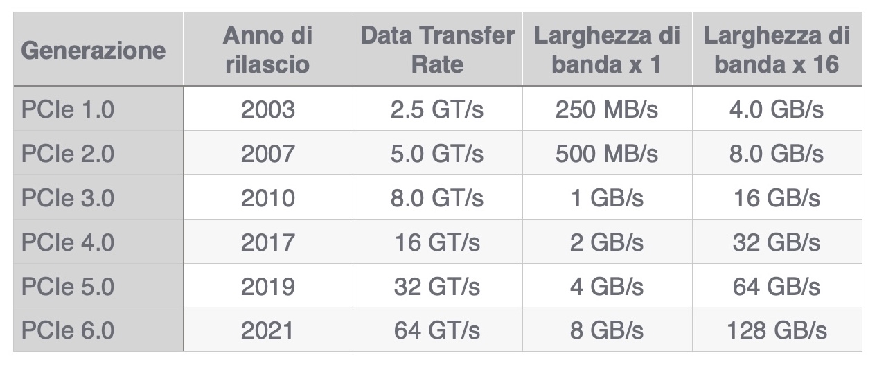 Nel momento in cui scriviamo le ultime generazioni disponibili sono PCIe 4.0 e PCIe 5.0, con ulteriori sviluppi ancora in corso.  La principale differenza tra le versioni PCIe, come è facile immaginare, è la velocità di trasferimento dei dati. Ogni nuova versione dello standard PCIe raddoppia la velocità rispetto al precedente. Come accennato, gli slot PCIe sono disponibili in cinque configurazioni sulle schede madri:  x1, x2, x4, x8 e x16, riferimenti alle linee (canali) disponibili.