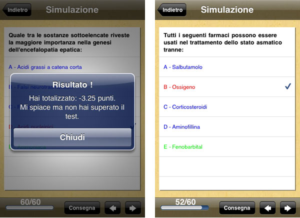 Il piatto forte dell’applicazione è la Simulazione per verificare “sul campo” il proprio livello di preparazione: avviata l’opzione, SSM Trainer simula una vera prova di esame con 60 domande, la possibilità di consegnare il compito virtuale anche a prova incompleta, e alla fine restituisce il sospirato verdetto. Mediante le freccette è poi possibile scorrere l’elenco delle domande del test appena svolto ed evidenziare gli errori commessi.