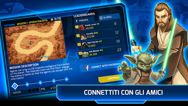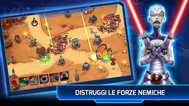 Naturalmente gli utenti che scelgono il lato Chiaro della Forza impersonano i Ribelli, così avremo a disposizione laser, navicelle e torrette che nei numerosi film della saga, così come in questo tower defense, permetteranno di indebolire sino ad annientare le forse dell’Impero. Anche se il gioco è gratuito occorre ricordare che è presente un sistema di crediti e di energia che potrebbe richiedere un accesso più o meno obbligatorio al negozio integrato nell’app per eventuali acquisti in app.