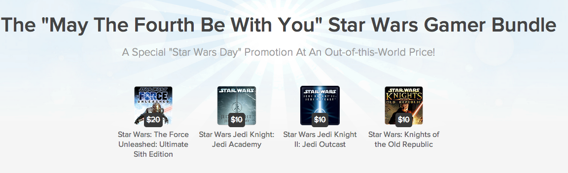 Ma costano 3,4 dollari, quindi 2,45 euro, anche Star Wars Jedi Knight: Jedi Academy e Star Wars Jedi Knight II: Jedi Outcast: Star Wars: The Force Unleashed: Ultimate Sith Edition costa invece 5 euro. È anche possibile comporre un bubdle, il May The Fourth Be With You Star Wars Bundle, che contiene tutti i giochi. spendendo solo 16,50 dollari, corrispondenti a 12 euro, contro i 18 che spendereste comprando gli stessi giochi su Mac App Store.
