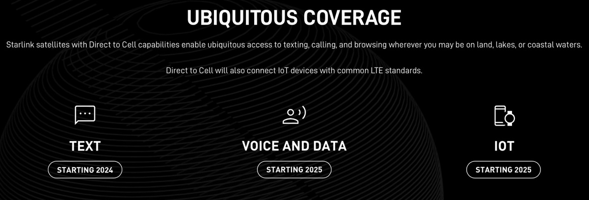 Il servizio promette “Accesso senza soluzione di continuità a messaggi, voce e dati per telefoni LTE in tutto il mondo». In ogni caso per il pacchetto completo bisogna pazientare un po’ perché nel 2024 è previsto l’arrivo dei messaggi di testo, mentre per chiamate vocali e accesso a Internet e dati bisogna aspettare il 2025.