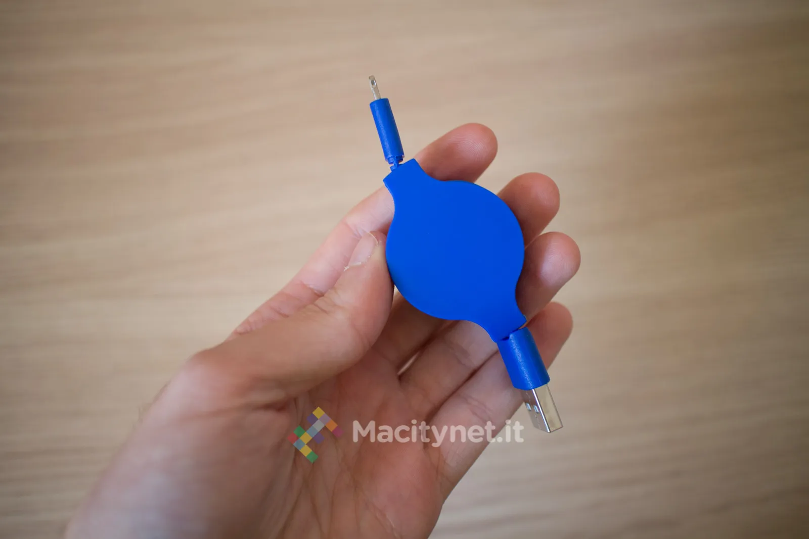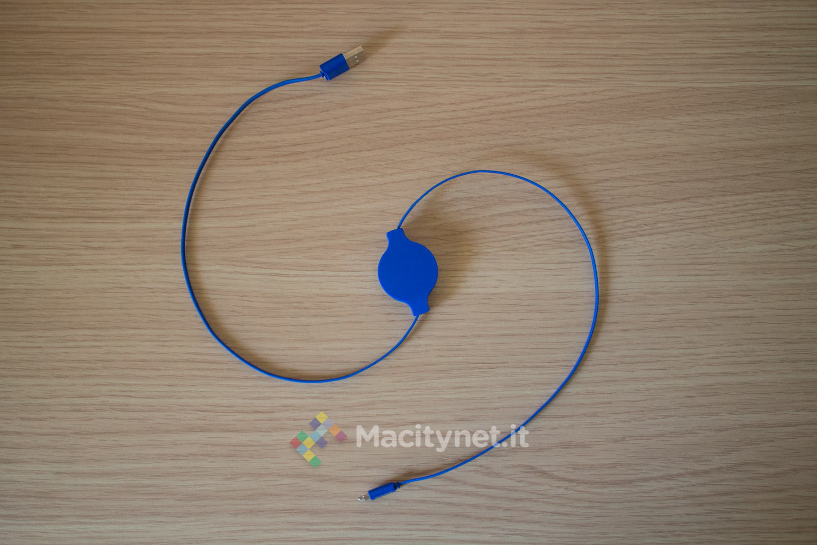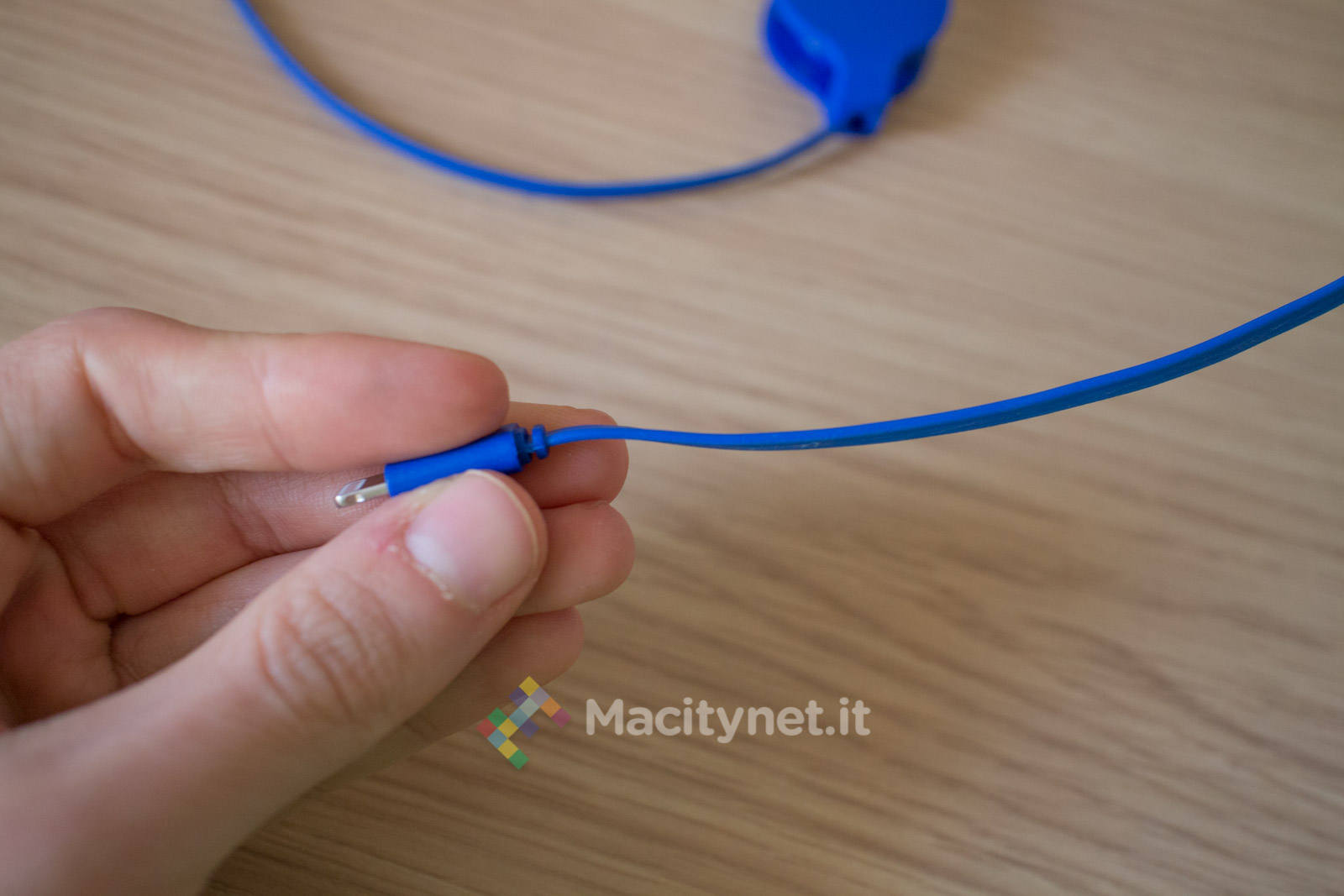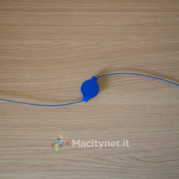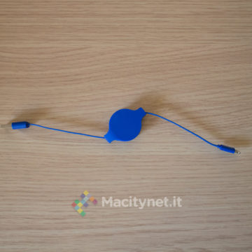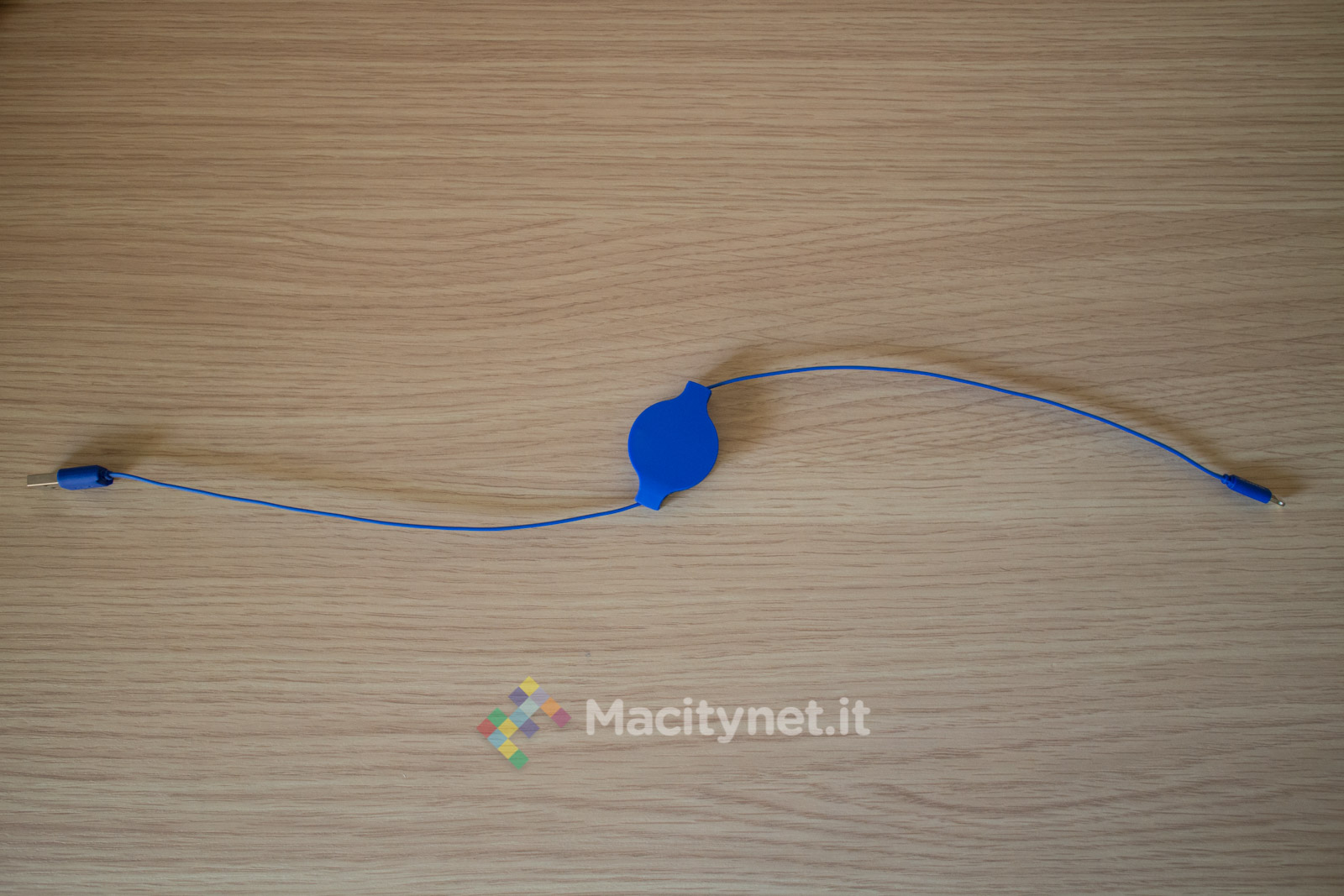 Al massimo dell’estensione, il cavo è lungo intorno ai 78 centimetri. Segnaliamo la possibilità di poterlo usare anche a diverse lunghezze, potendo così adattarlo alle proprie esigenze. Durante l’estensione si sentiranno infatti dei piccoli “clack” che ci segnaleranno il raggiungimento di uno scalino che semplicemente blocca il cavo, evitandone il riavvolgimento.