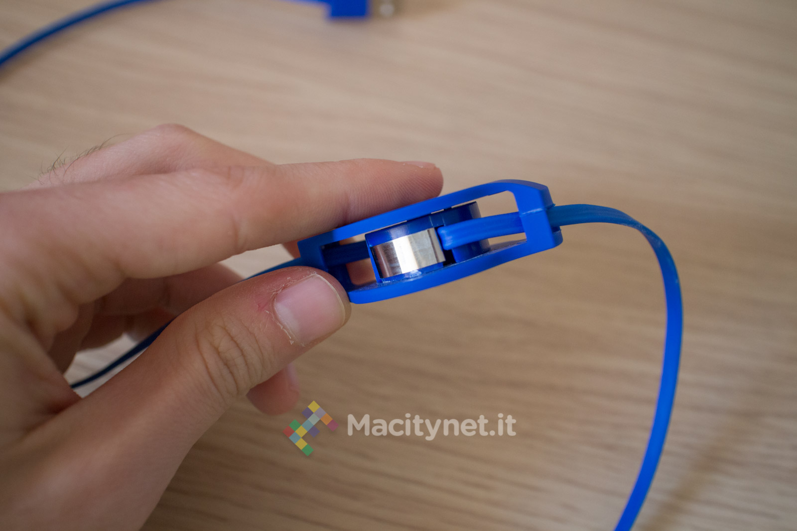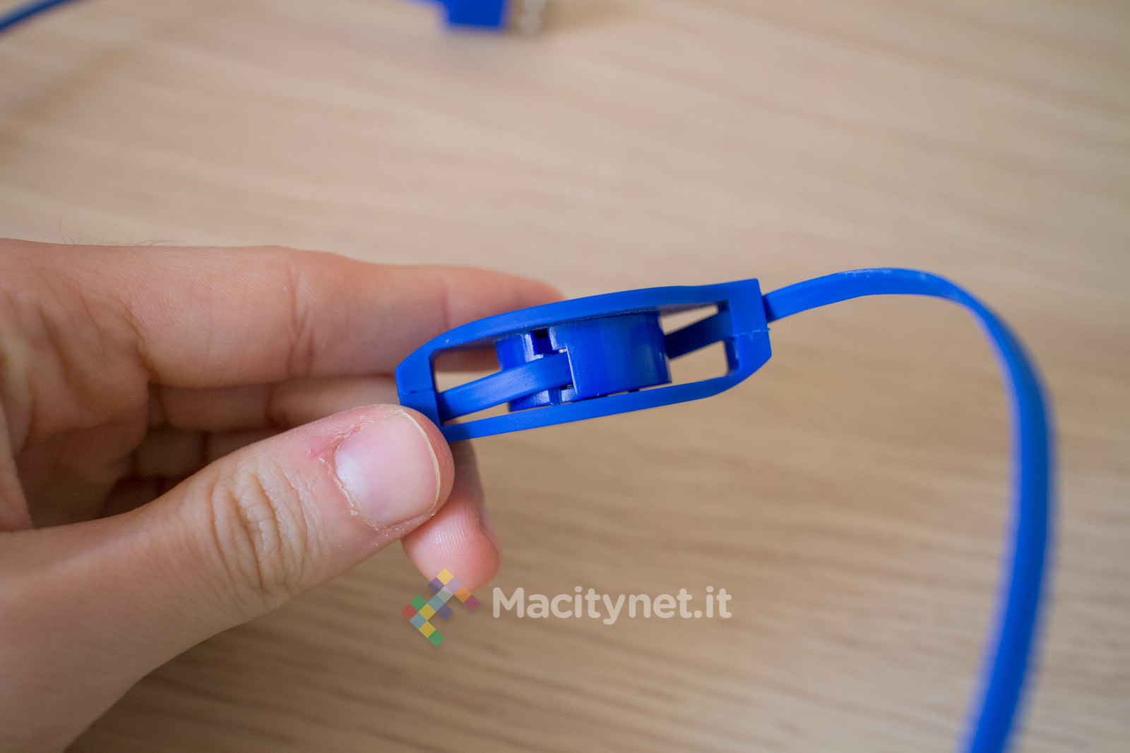 Ad evitare questa problematica c’è, per l’appunto, un sistema di chiusura retrattile, una sorta di rotella a moll del diametro di circa 3,5 centimetri che arrotola il cavo al suo interno quando non è in uso. Così potremo tranquillamente infilarlo nella tasca dei pantaloni, in un marsupio, una borsa o nel portaoggetti dell’auto senza correre il rischio di ritrovarlo avvinghiato a qualche altro accessorio.
