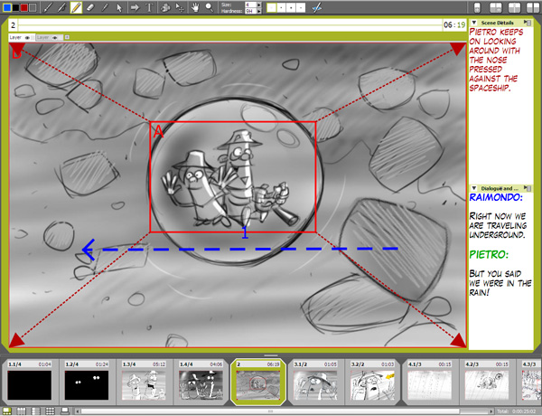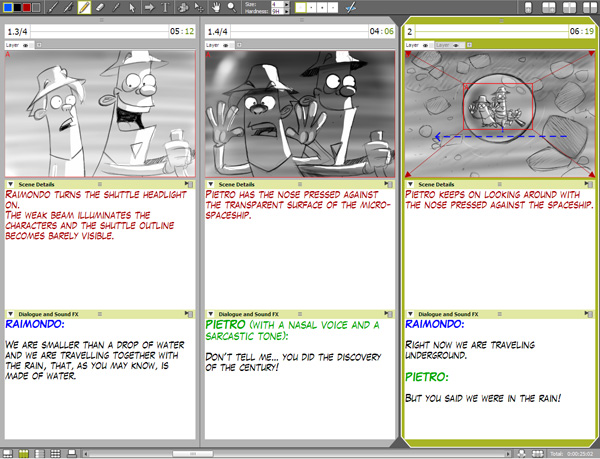 Per completare lo storyboard il software offre anche la possibilità di indicare i movimenti della camera, ingrandimenti, inquadrature dei dettagli posizionando una serie di frecce direttamente sopra gli schizzi. Quando il lavoro è completato sono disponibili diverse alternative per esportare lo storyboard in formato elettronico oppure per stamparlo. Oltre a realizzare file in formato PNG per esportare le diverse scene, possiamo creare un unico documento PDF creando e impostando il layout preferito. Ricordiamo infine la possibilità di esportare lo storyboard direttamente all’interno di Toonz, il programma realizzato da Digital Video per la creazione di veri e propri cartoni animati e animazioni.