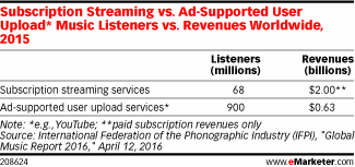 Nonostante non si tratti di numeri da capogiro, la crescita è stata costante e l’incremento, ma 27 milioni di nuovi abbonati in un solo anno è da considerarsi un segno positivo per il mercato. L’IFPI evidenzia però come lo strumento prediletto per chi vuole ascoltare musica online siano ancora i servizi di upload musicale supportati dalla pubblicità, come ad esempio YouTube e Soundcloud.