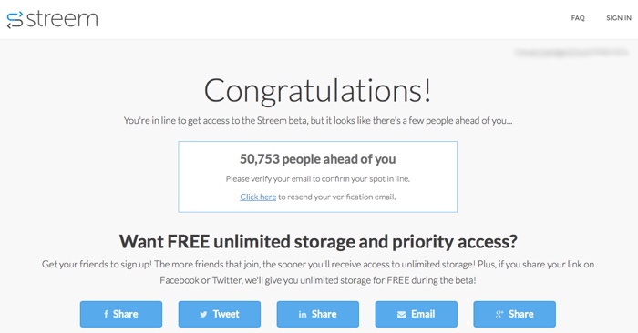 Per ottenere lo spazio cloud gratuito infinito di Streem occorre iscriversi alla beta da questo link: nel momento in cui scriviamo oltre 50mila persone sono già in coda per ottenere lo storage infinito. Notiamo però che la spazio cloud gratis infinito durerà solo per tutto il periodo di beta e poi anche per un ulteriore mese dopo il lancio effettivo di Streem, dopo di che questo abbonamento sarà proposto a 20 dollari al mese, più uno sconto per chi ha partecipato alla beta. In alternativa Streem proporrà ai propri utenti un account gratuito con 20 GB di spazio gratis online. Streem funzionerà su Mac e PC Windows, Linux oltre a iPhone, iPad, dispositivi Android e anche su web.