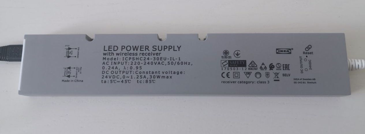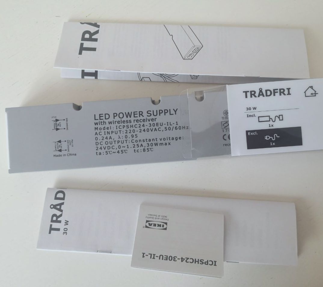 Se utilizziamo l’alimentatore IKEA Trådfri da 30 Watt potremmo gestire teoricamente 6 metri di una striscia da 5 Watt per metro oppure 2 metri di una striscia da 12 o 15 watt per metro.