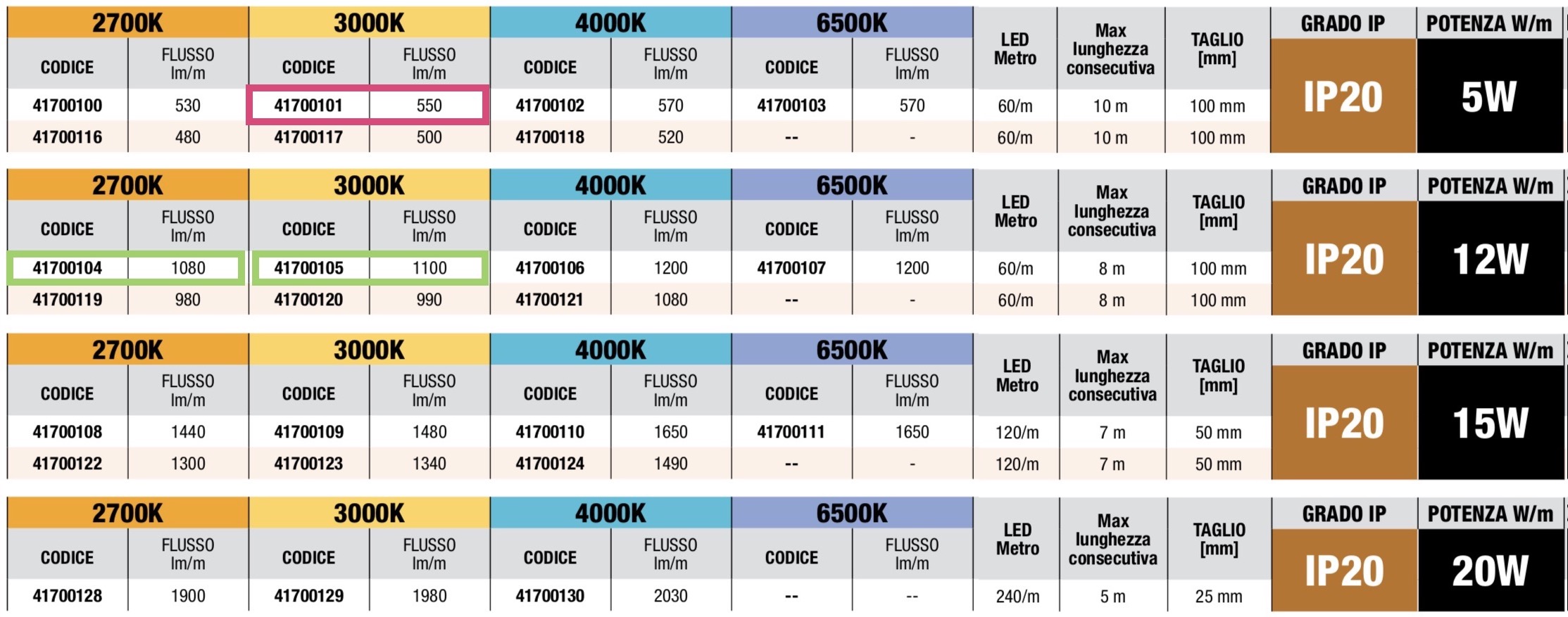 Qui sotto vediamo una tabella con varie tipologie di strisce in commercio