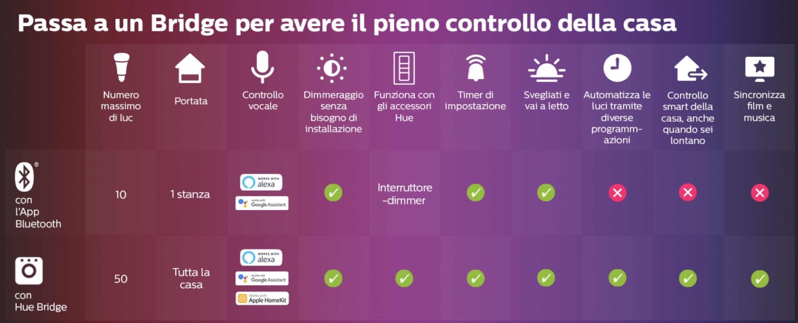 E’ possibile aggiungere Hue Bridge al vostro sistema (venduto separatamente) per godere di tutte le funzionalità come: controllo fino a 50 luci, 16 milioni