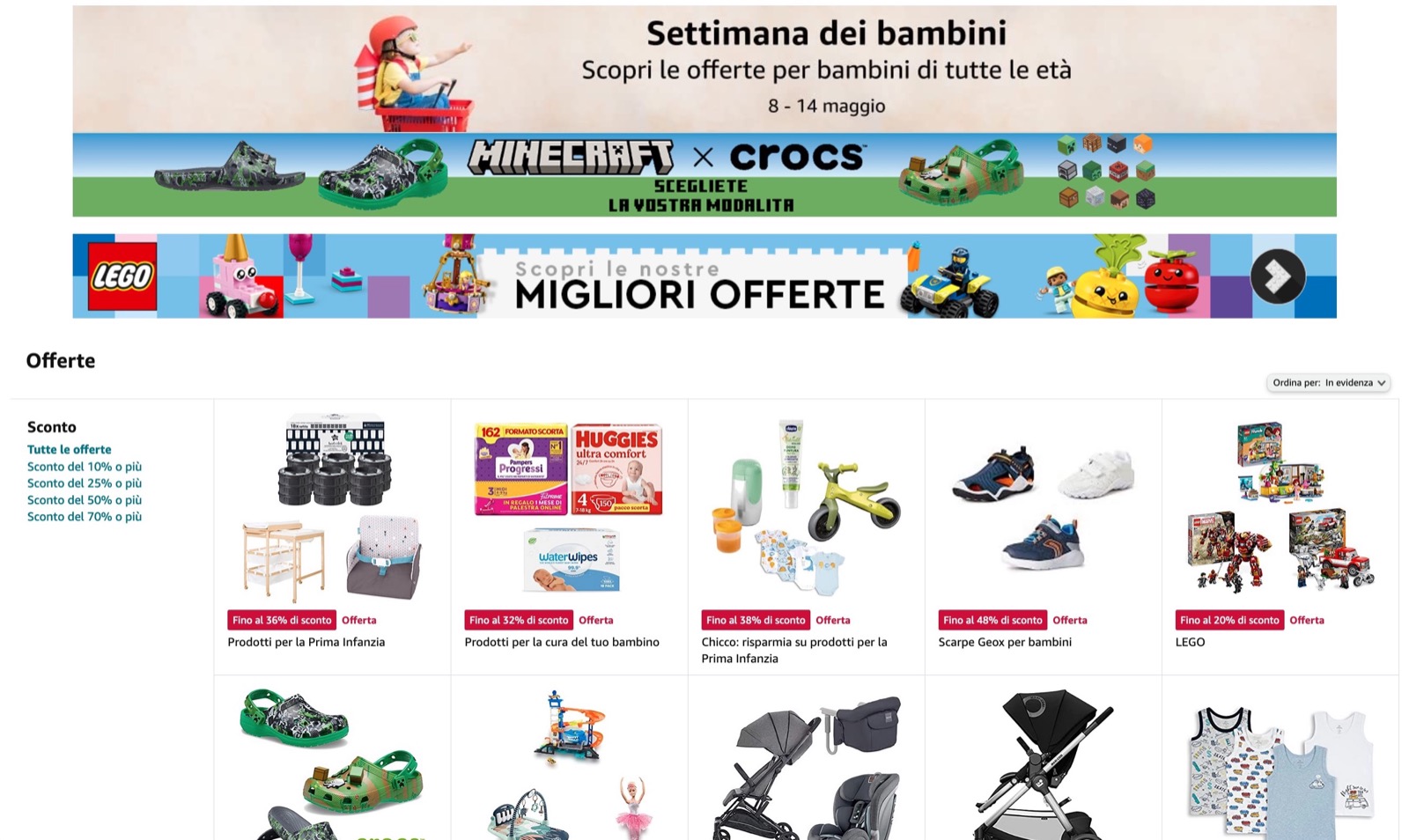 Se avete figli o nipoti, questo è il momento giusto per fare shopping o anticiparsi i regali: su Amazon infatti è appena partita la Settimana dei bambini, una speciale vetrina (qui) in cui fino al 14 Maggio sarà possibile risparmiare su centinaia di prodotti.