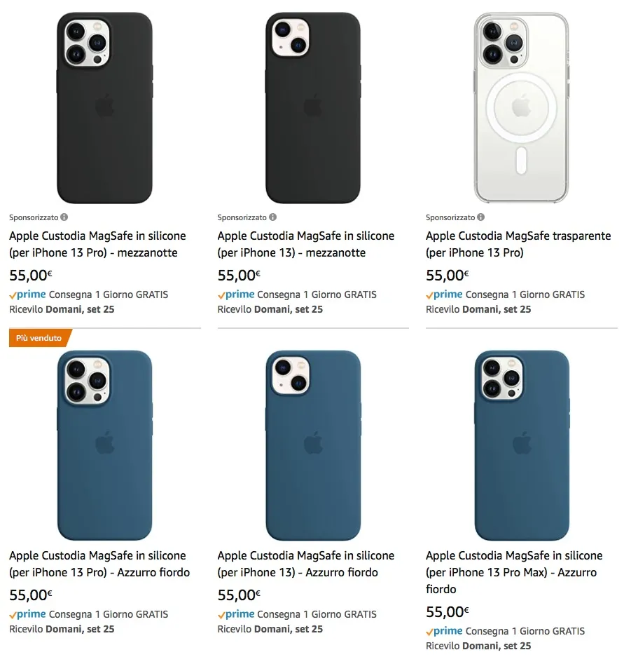 Amazon sta completando la sua offerta di prodotti per iPhone 13 e iPhone 13 Pro. Dopo avere aggiunto da ben prima del rilascio (grazie ai soliti cinesi) una lunga serie di custodie per il nuovo modello, da questa mattina offre praticamente l’assortimento completo. Stiamo parlando delle nuove custodie in palle e in silicone ma anche delle custodie trasparenti che fino a qualche ora fa non erano ancora disponibili.