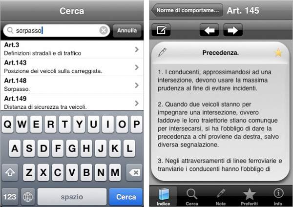 Da alcuni giorni è disponibile inoltre il Codice della Strada: si tratta del nuovo codice del DL del 30 prile 1992 numero 285, incluso il Regolamento di Esecuzione e di Attuazione del DPR numero 495 del 16 dicembre 1992, in una edizione digitale aggiornata a tutto il 2008. Il Codice della Strada è disponibile in questa pagina di App Store al prezzo di 4,99 euro. Entrambi i programmi offrono le stesse funzioni per quanto riguarda la navigazione per titoli e articoli, la ricerca degli articoli per testo e numero, la possibilità per l’utente di annotare ogni articolo, il posizionamento di segnalibri, l’invio degli articoli e anche delle note via email e molto altro ancora.