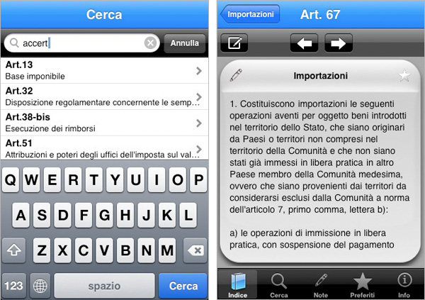 Prosegue il progetto degli sviluppatori italiani di iLex che intende portare in versione digitale su iPhone e touch i principali testi di legge e di riferimento normativo italiani. A partire da oggi infatti è disponibile su App Store il testo unico sull’IVA – Istituzione e discliplina dell’imposta sul valore aggiunto. Oltre al testo di riferimento originale, il DPR del 26 ottobre 1972 numero 633, l’edizione digitale è aggiornata a tutto il 2008. iLex IVA è proposto al prezzo di 3,99 euro in questa pagina di App Store.