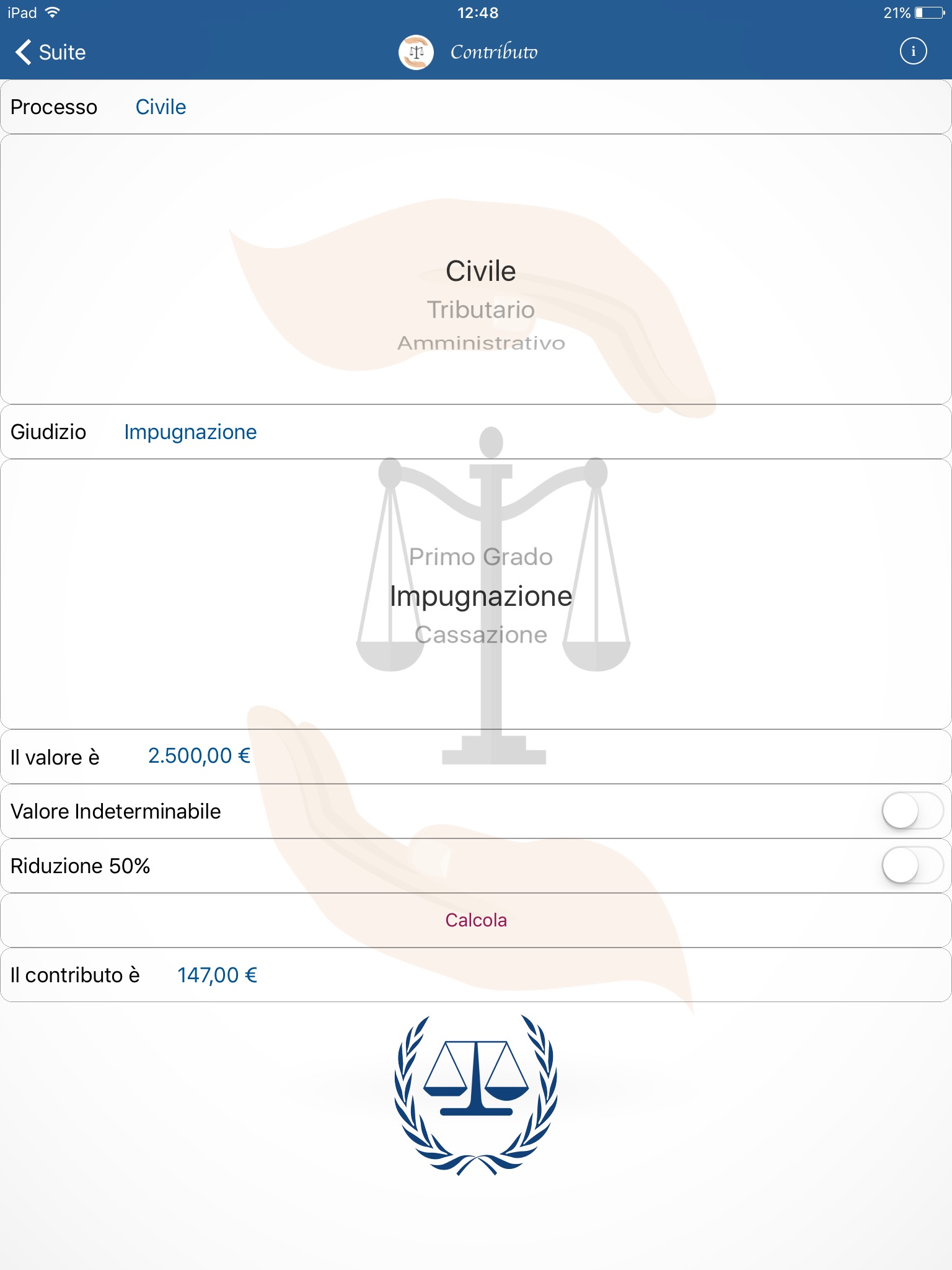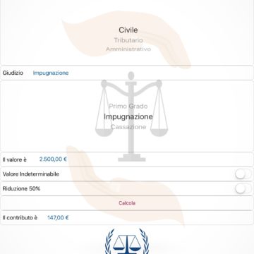 Al di là del calcolo dei termini, Suite Avvocato consente anche di calcolare il contributo unificato per l’iscrizione delle cause a ruolo. Naturalmente, è possibile scegliere l’autorità giudiziaria, il grado della causa e il valore, con possibilità di applicare la riduzione del 50%, nel caso di cause che prevedono il pagamento della metà del contributo unificato.