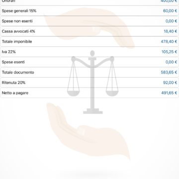 La terza sezione consente, invece, di calcolare i diritti di copia degli atti, in base al tipo di autorità giudiziaria, numero di copie, numero di pagine, copie semplici, autentiche, elettroniche o urgenti. Infine, la quarta prevede il calcolo delle fatture o l’eventuale scorporo. In questa sezione è possibile inserire nome della pratica, l’importo, spese esenti e spese non esenti, così da ottenere tutti i valori necessari per redigere la relativa fattura, comprensiva o meno di spese generali o ritenuta d’acconto a seconda delle esigenze.
