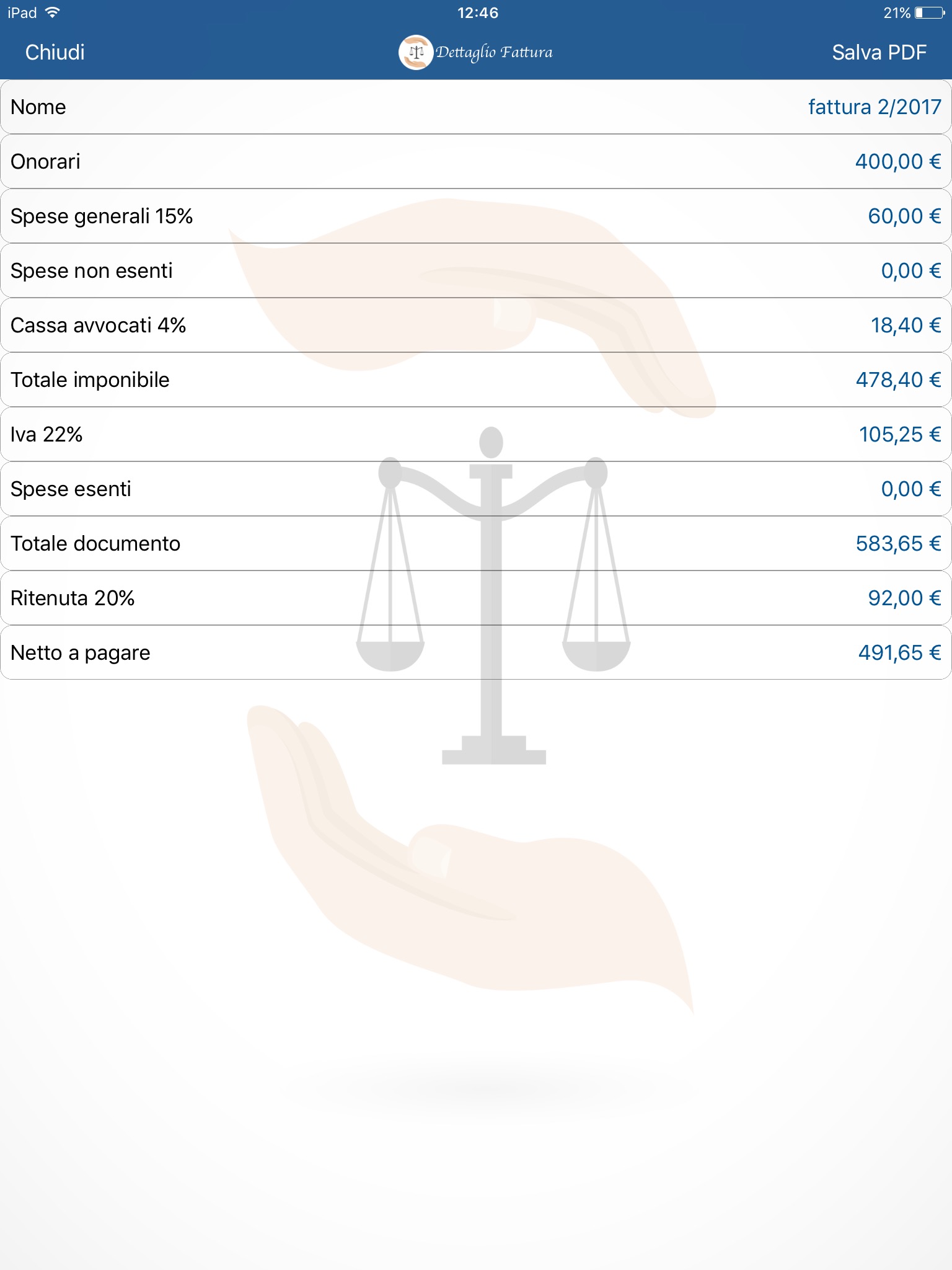 Ogni fattura o scorporo può essere esportato in formato PDF e rimane disponibile all’interno dell’applicazione, con facoltà di stamparla, condividerla via mail o altri servizi.