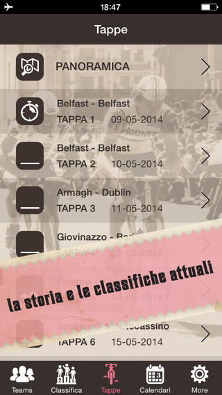 L’app Giro d’Italia 2014, pur non essendo l’app ufficiale di RCS per il Giro d’Italia, offre agli appassionati di ciclismo e a chi non vede l’ora di scoprire quale sarà la maglia rosa 2014 contenuti interessanti per prepararsi a seguire le tappe della gara che incomincerà il prossimo 9 maggio a Belfast.