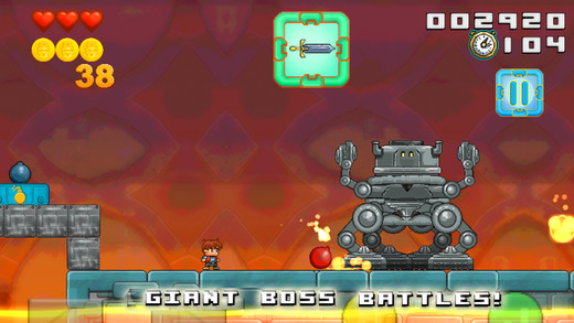 Come nel più classico dei platform game, il giocaotre dovrà attraversare livelli pieni zepi di nemici, ostacoli e trappole da schivare, potendo utilizzare un collaudato schema di controllo. Sulla parte bassa dello schermo, infatti, sono presenti le frecce direzionali per spostare il personaggio, mentre altri due pulsanti virtuali consentono di effettuare il salto e di attaccare. Il protagonista sarà equipaggiato da una classica spada, anche se con il progredire nei livelli saranno disponibili armi più potenti e power up da acquistare nello shop virtuale: archi, frecce, bombe, boomerang e perfino spade magiche. Insomma, l’armamentario richiama alla memoria capolavori come Zelda. Di certo la longevità non è paragonabile a quest’ultima produzione, ma in ogni caso i 64 livelli proposti rappresentano una buona media all’interno del panorama iOS.