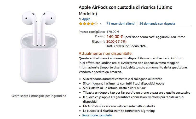 Unica avvertenza: le AirPods 2 a 149 euro sono al momento ordinabili ma senza una data precisa di consegna. In passato quando questo è accaduto, la spedizione effettiva è stata dopo pochi giorni. Del resto sembra difficile che Amazon resti senza AirPods 2 per lungo tempo. Il consiglio è quindi di comprare sapendo che questo sarà il prezzo garantito quando dovessero essere rese disponibili, indipendentemente dal fatto che una volta a magazzino il prezzo dovesse aumentare.