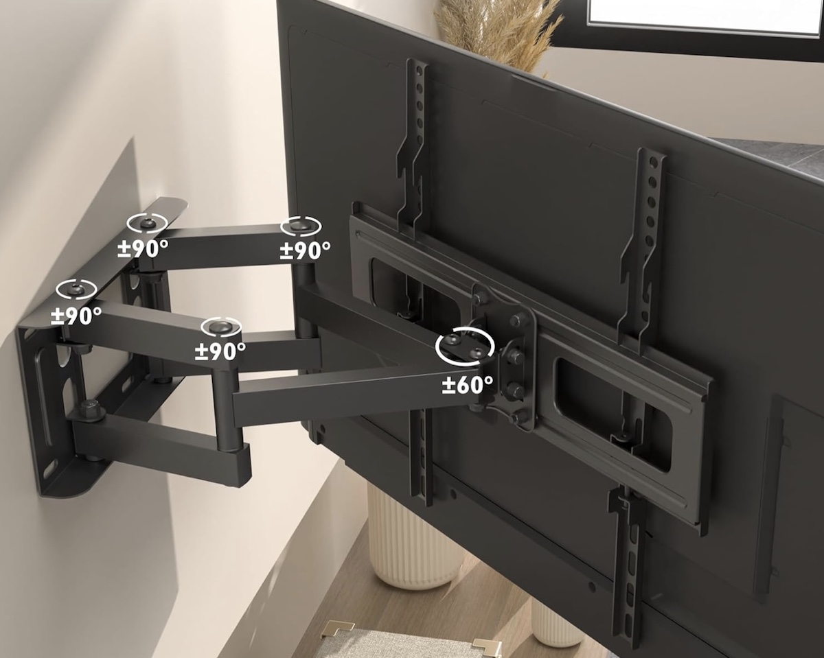 Il supporto BONTEC è progettato per adattarsi a una vasta gamma di televisori, inclusi modelli LED, LCD e al plasma, con standard VESA da 100×100 a 600×400 mm. La struttura è realizzata in acciaio resistente, con doppio braccio articolato che garantisce stabilità e sicurezza anche per schermi di grandi dimensioni. Il braccio consente estensione fino a 389 mm e retrazione a soli 71 mm dalla parete.