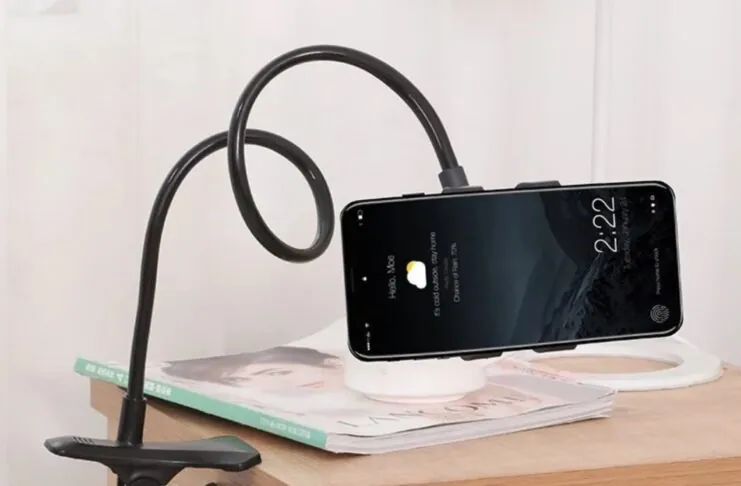Al posto della solita base infatti utilizza una pinza che permette di fissarlo al bordo di un tavolo, alla testata di un letto o altre superfici per sostenere il telefono e posizionarlo dove più fa comodo, così da averlo sotto gli occhi e senza doverlo tenere in mano.