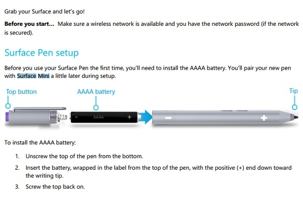Nel manuale di Microsoft vi sono almeno quattro riferimenti al Surface Mini, incluso il riferimento a una procedura di abbinamento e utilizzo della “Surface Pen”. Altri riferimenti parlano del Mini “quando si utilizza OneNote” e di “funzionalità di blocco della rotazione dello schermo”.