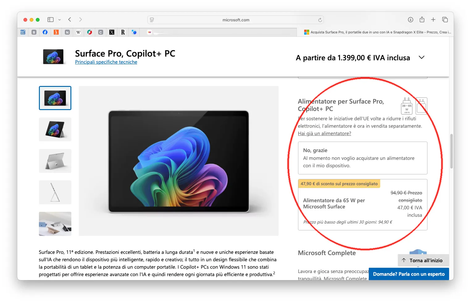 Dal sito italiano di Microsoft in fase di ordine è possibile selezionare il processore (SnapDragon X Plus 10 Core o SnapDragon X Elite 12 Core), colore, specifiche e se inserire o no l’alimentatore (94,90 euro ma nel momento in cui scriviamo è scontato a 47,90€). Anche nel ngozio Microsoft su Amazon viene espressamente indicata l’assenza dell’alimentatore nella confezione del computer.