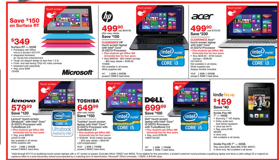 Le cose per il Surface non devono andare benissimo se, come confermato dal rivenditore USA Staples, a partire da domenica il tablet Microsoft subirà un calo di prezzo significativo. La versione base da 32 GB potrà essere acquistata ad un prezzo di 350 dollari (450 con touch cover), mentre la versione da 64 GB scenderà a 450 dollari (550 con touch cover). Un calo di prezzo di 150 dollari per modello che segna probabilmente l’inizio della parabola discendente per questa prima generazione di Surface RT.