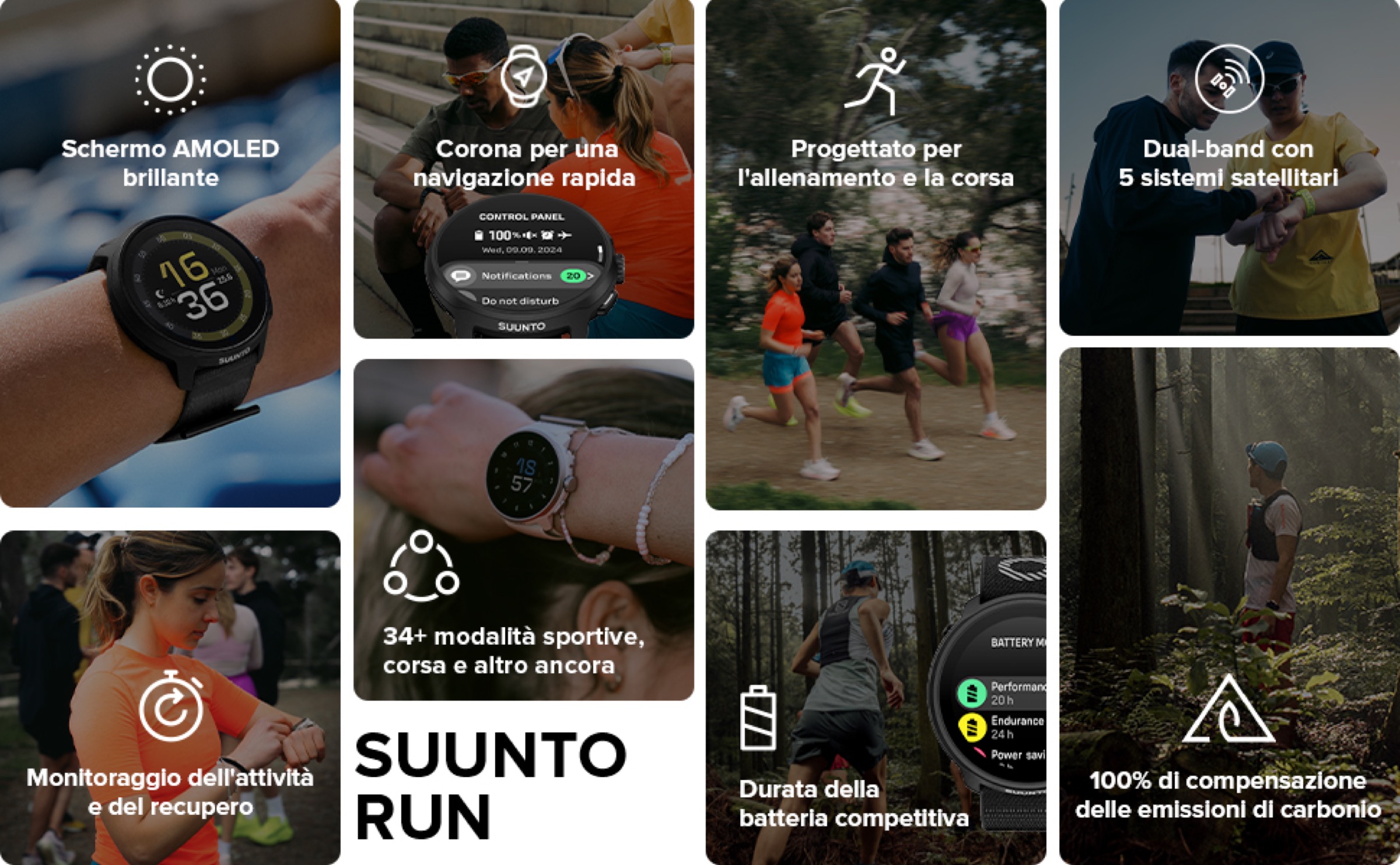 Offre diverse modalità specifiche per la corsa tra cui maratona, ghost runner (per gareggiare contro il proprio passo ideale) e corsa su pista, affiancate da 34 modalità sport per attività complementari come ciclismo, yoga o allenamento funzionale.