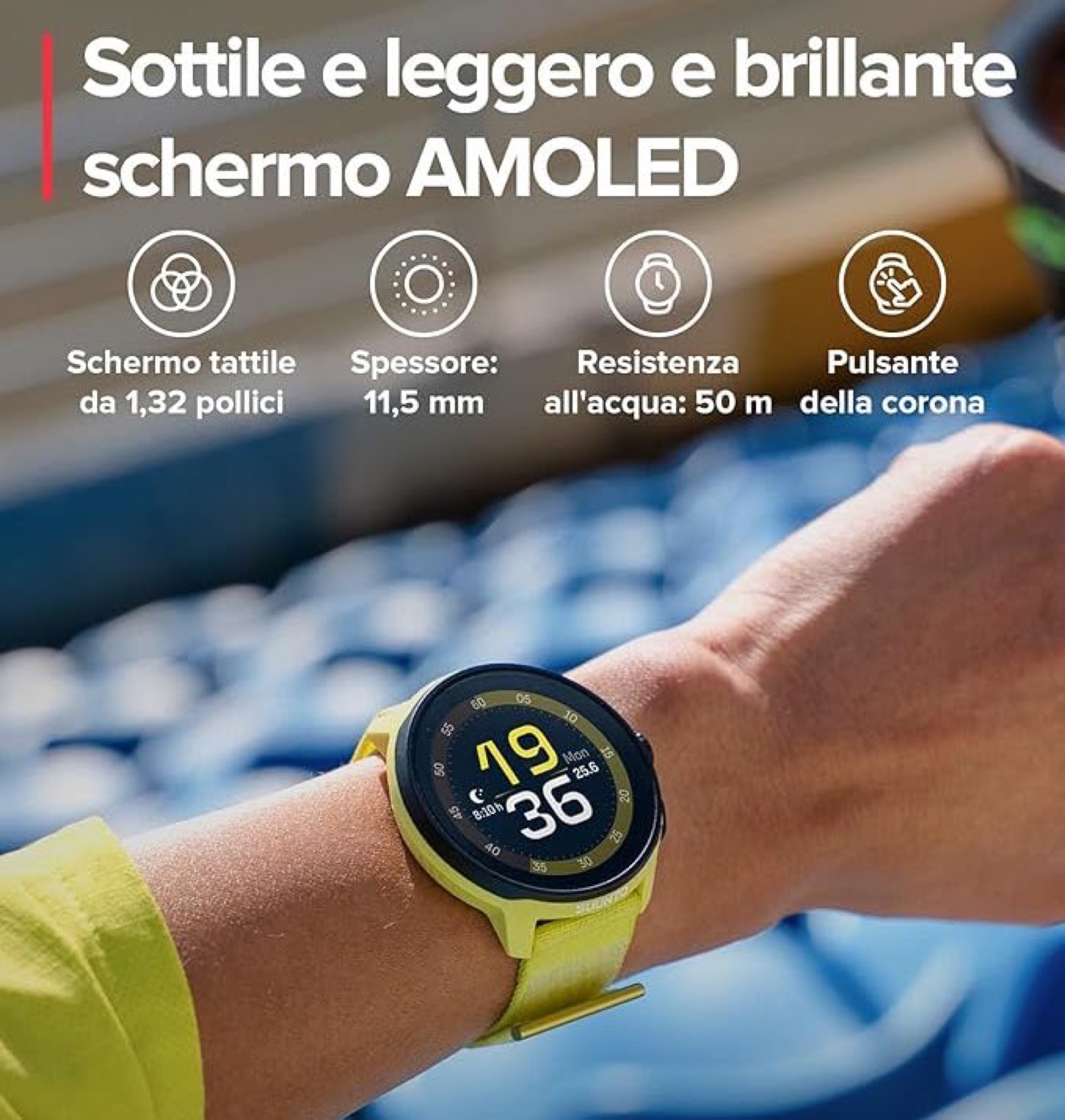 Il corpo pesa 36 grammi ed è abbinato a un cinturino in tessuto disponibile in quattro colorazioni. Segnaliamo infine che l’orologio è compatibile con tutti i cinturini Suunto da 22 mm, per chi desidera personalizzare ulteriormente l’estetica.