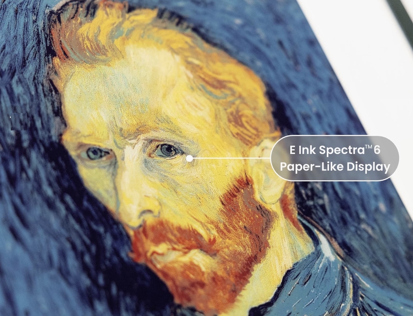 Il cuore del dispositivo è il pannello E-Ink Spectra 6, un’evoluzione pensata per portare la resa cromatica a un livello del tutto nuovo nel settore degli e-paper. La superficie simula fedelmente la texture materica di un dipinto, con strati cromatici che ricordano la pittura a olio e una finitura che replica la sensazione visiva della tela.