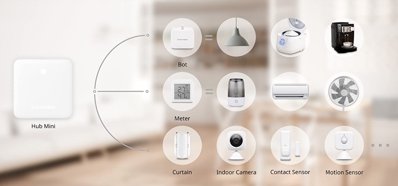 Essendo un Hub Wi-Fi e Bluetooth il modello mini è in grado di comandare con una sola app anche anche tutte le altre periferiche SwitchBot quali motori per tende (utile per proteggere una stanza dal sole) interruttori meccanici esterni (potete avviare una ventola più tradizionale) e ricevere dati da sensori di ogni tipo.