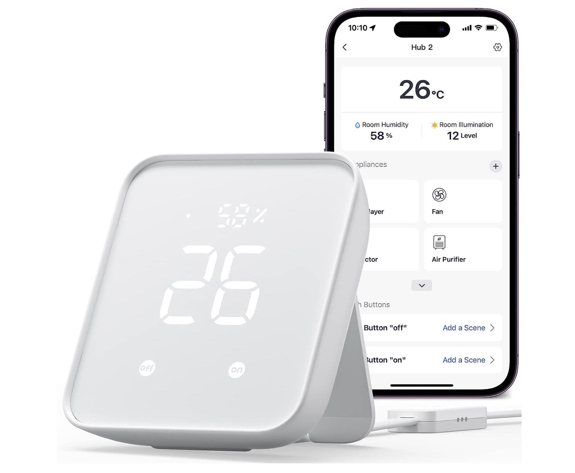 Se poi volete acquistare un modello più avanzato SwitchBot ha messo sul mercato da poco tempo una versione potenziata del suo Hub che in più ha bordo sia un sensore di umidità e temperatura con un display che mostra i valori attuali, due pulsanti touch programmabili (per gestire automazioni e azioni) e un sensore di luminosità.