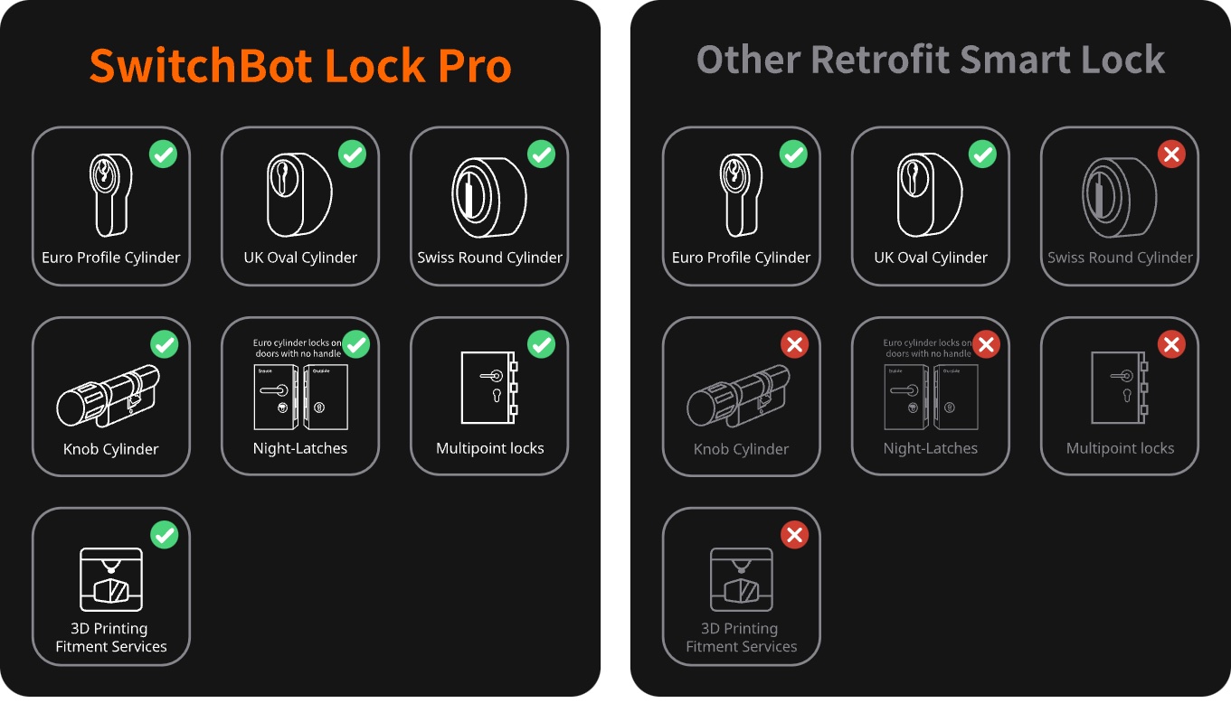 Il nuovo modello supporta più standard di serrature appartenenti a diverse regioni per una installazione che non necessiti di forare o danneggiare la porta o la serratura esistente o di manomette la funzionalità della chiave originale, consentendo di utilizzarla comunque in caso di necessità.