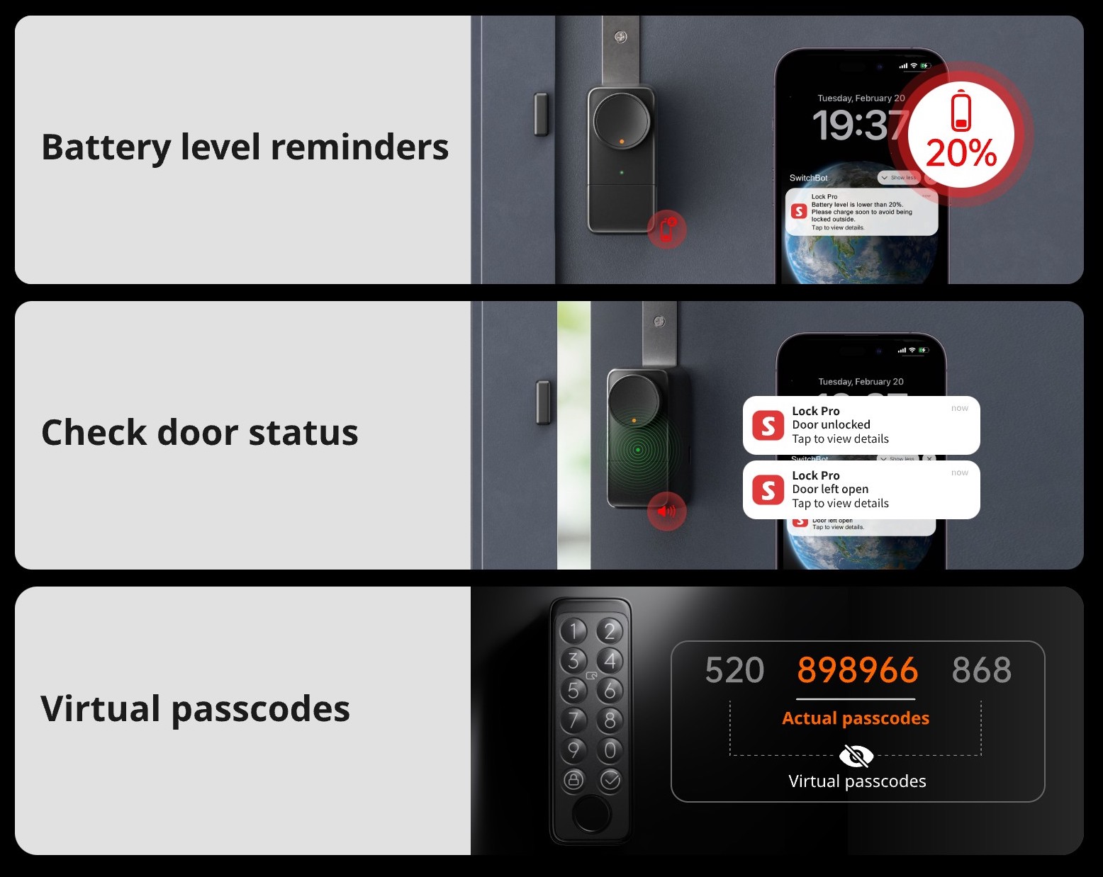 - Notifiche in tempo reale che forniscono lo stato della serratura, lo stato della porta e altro ancora, tutto tramite l’App di Switchbot. Con promemoria automatici per quando si dimentica di chiudere a chiave o chiudere la porta.