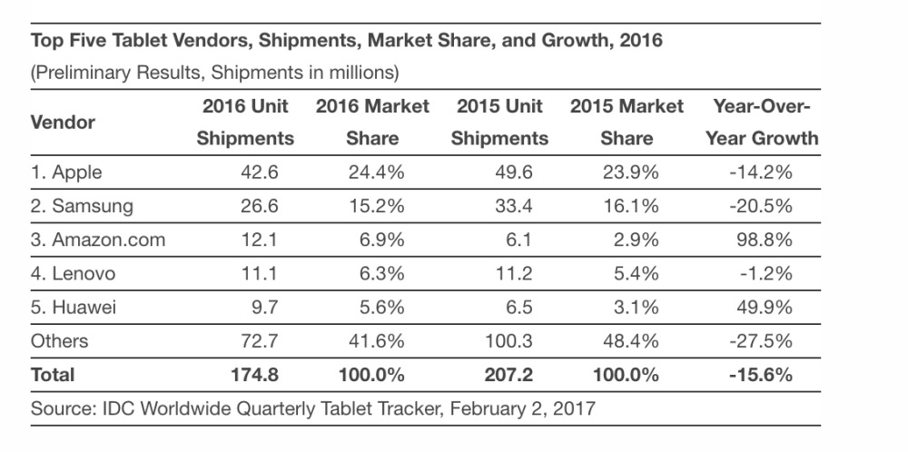 Le due società di analisi hanno entrambe rilasciato i dati di vendita relativi al mercato tablet per l’ultimo quarto del 2016 e per l’intero anno. Poche e trascurabili le differenze fra i due report: l’unica rilevante è il peso dato ad Amazon e al suo Kindle Fire, terzo in classifica di vendite nel Q4 2016 per Strategy Analytics, mentre solo quinto per IDC.