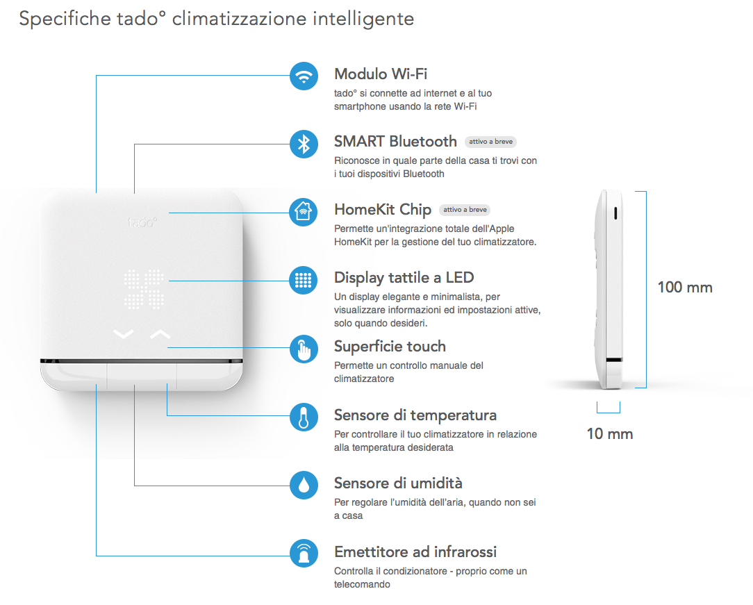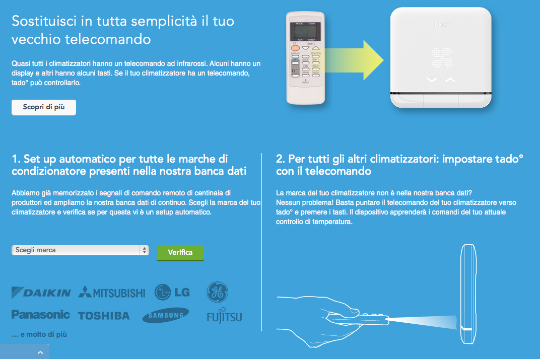 Se il vostro climatizzatore ha un telecomando ad infrarossi è sicuramente gestibile dal dispositivo Tado visto che per i modelli non elencati nella lista di compatibilità che trovate su queste pagine c’è la possibilità di imparare direttamente i comandi via infrarossi.