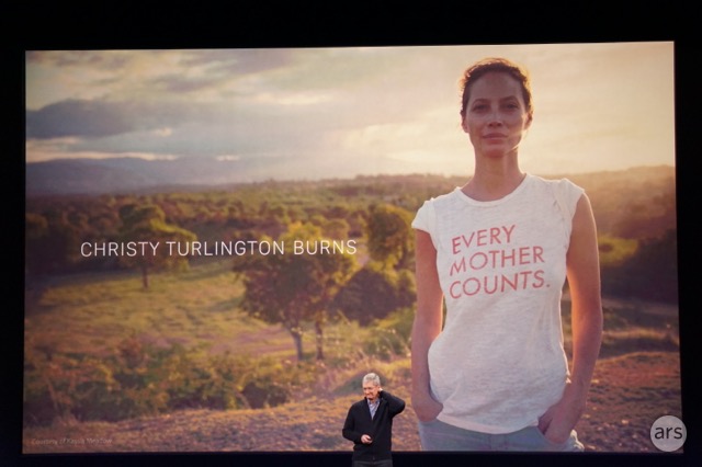 La supermodella statunitense Christy Nicole Turlington Burns è il volto di Apple Watch: icona della moda, mamma, maratoneta, attiva nel sociale a favore delle madri in difficoltà nei paesi più poveri del mondo è stata scelta da Tim Cook come testimonial dell'orologio di Cupertino.