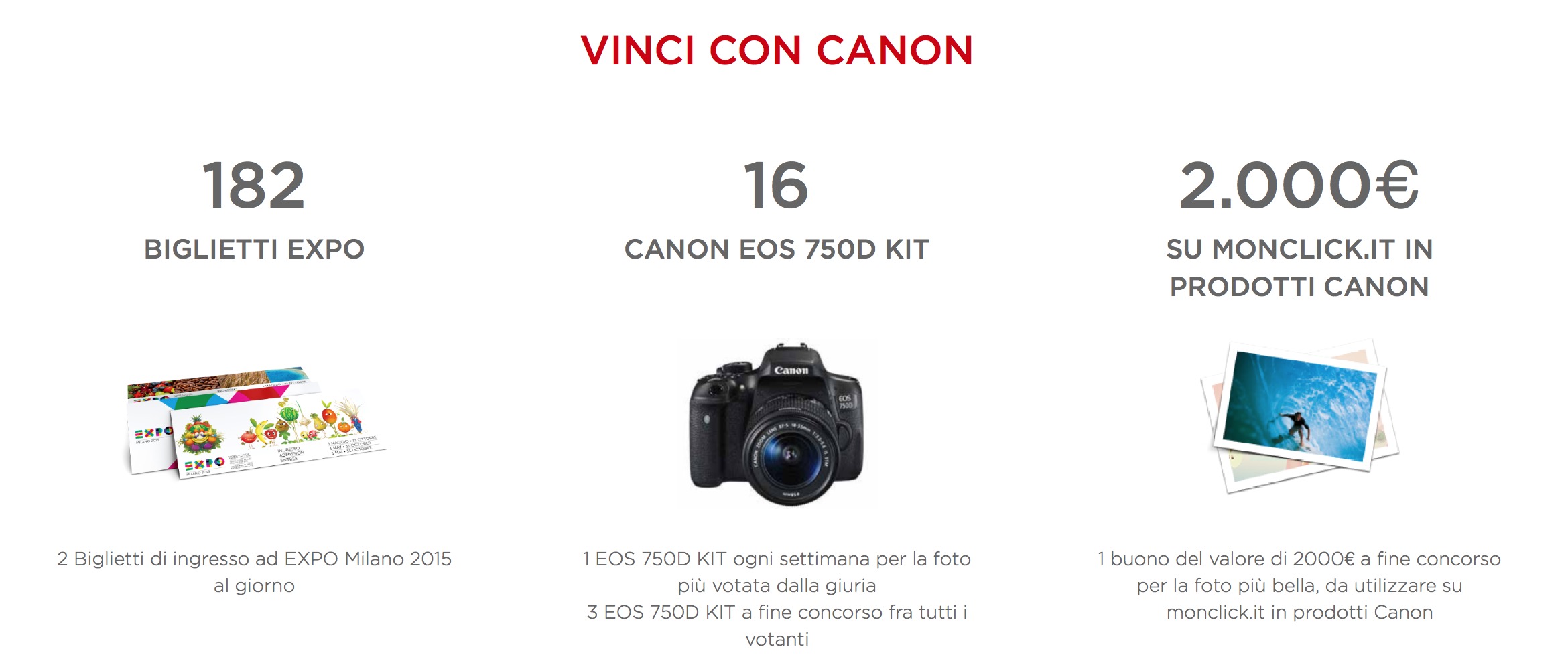 E' ancora in pieno svolgimento il concorso Canon su Expo Milano 2015: è sufficiente registrarsi e caricare una foto per provare a vincere kit EOS 750D, biglietti per Expo o un buono acquisto Monclick del valore di 2.000 euro
