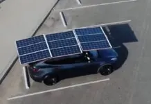 Chiuso sembra un box portapacchi per il tetto dell’auto, aperto è un pannello solare che ricarica Tesla Model Y